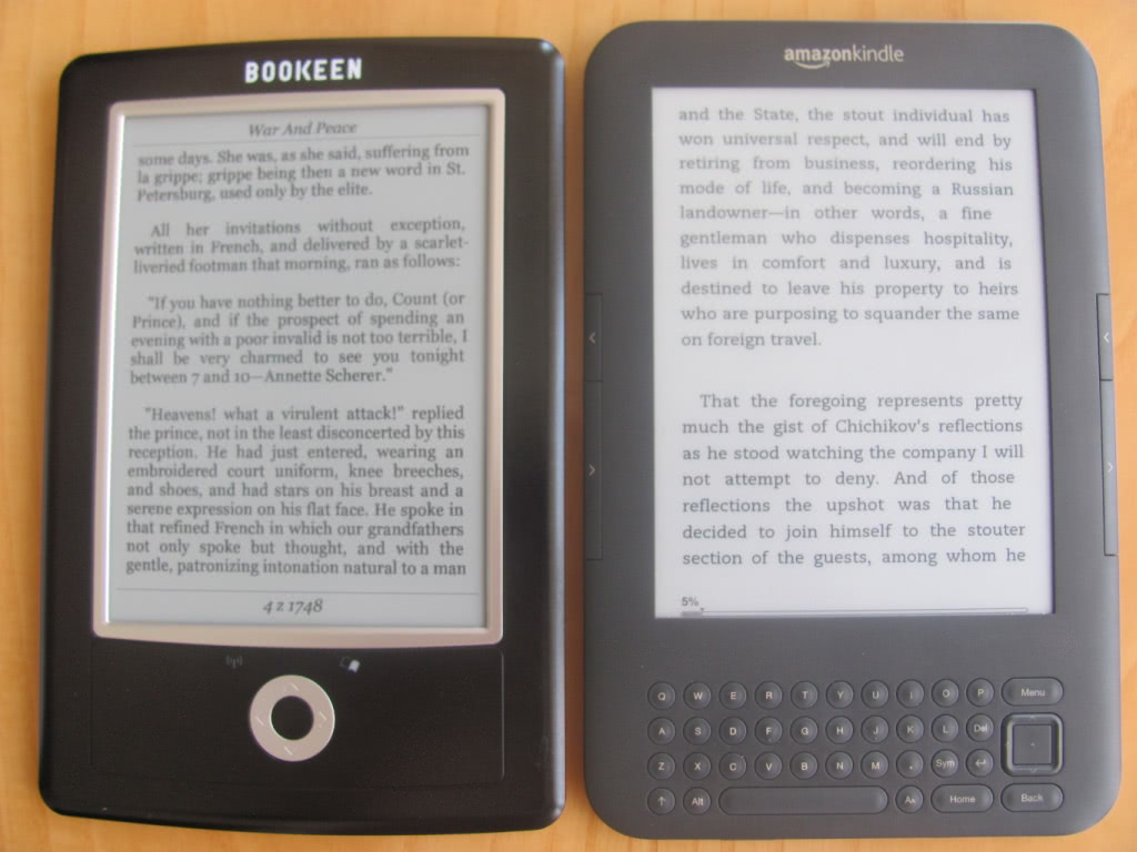 Bookeen Cybook Orizon má skoro identické rozmery ako Kindle, podobnú hmotnosť, rovnako veľký 6" displej, udávanú výdrž 3 týždne na jedno nabitie. Na prvý pohľad si však všimnete absenciu klávesnice, z hadrverových ovládacích prvkov je na tele prístroja prítomný len päťsmerový ovládací prvok a zapínacie tlačidlo. Na konektivitu slúžia WiFi, Bluetooth a micro-USB rozhranie. Na rozdiel od Kindle táto čítačka obsahuje slot na Micro SD karty a hlavne dotykový displej s akcelerometrom. Cena v kníhkupectve Martinus je 239€.